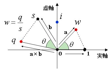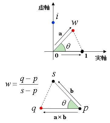 複素数平面上の書いた2つのベクトルの間の角度とベクトルの長さの比をあらわす複素数wが以下の図のようにあらわせます。