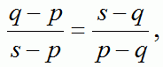 この式は、複素数平面上の点s,p,qを結ぶ三角形が正三角形になるための必要十分条件です。