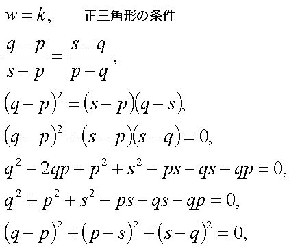 式w=kは、複素数平面上の点s,p,qを結ぶ三角形が正三角形になるための必要十分条件です。