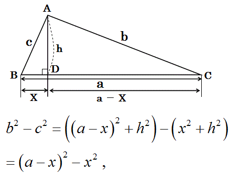 点Dで分割された底辺の長さの二乗どうしの引き算になります(三角形の辺の二乗の引き算の公式)。