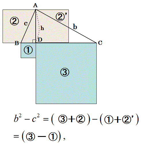 三角形の辺の二乗の引き算の公式は、以下の図の正方形①②③を心が思い描いて心が公式を導き出すので、覚え易い(導き出し易い)です。