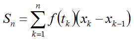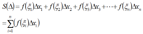 いま,それぞれの小区間[xi−1, xi] のなかの任意の位置に点ξi をとり,Riemann 和 (Riemann sum) とよばれる次の和を考えます.